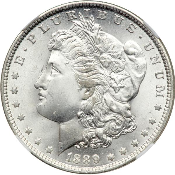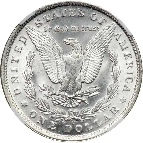 1889-O Morgan Dollar. NGC graded MS-66. Well struck, frosty, and fully white. Truly remarkable quality for this often poorly produced O-mint release. The frosty surfaces have been spared from all but the slightest evidence of contact and, on the obverse, are Liberty's profile is awash in fantastic silvery iridescence. If you are a silver dollar specialist who is assembling a top-notch Registry Set, don't miss this opportunity! Pop 5; none finer at either service (PCGS # 7192) .