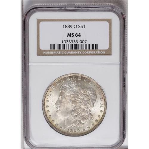 <B>1889-O<img border='0' src='http://www.heritagecoins.com/images/star.gif' width=10 height=10>$1> MS64 NGC.</B></I> Lustrous and attractive with lovely gold, peach and silver coloration. Typically soft in the centers, with scattered modest abrasions that preclude a Gem grade assessment.