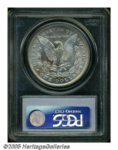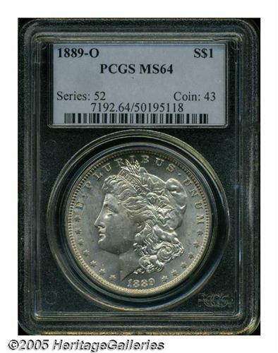 <B>1889-O<S$1> MS64 PCGS.</B></I> A fairly typical example of this scarce issue in this grade: the strike is soft in the centers and there is heavy metal flow toward the rims, which would indicate improper basining of the dies. Excellent luster and minimally abraded, with pale gold toning on each side and a splash of red-brown color near the reverse center.