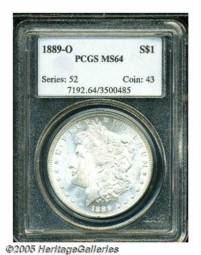 <B>1889-O<S$1> MS64 PCGS.</B></I> Although the strike is not 100% full in the centers, it is far sharper than the typical 1889-O Dollar, and is about as bold as this issue can be found. Potent cartwheel luster and only a hint of gold color further increase the eye appeal. Small marks near the mouth deny a higher grade.