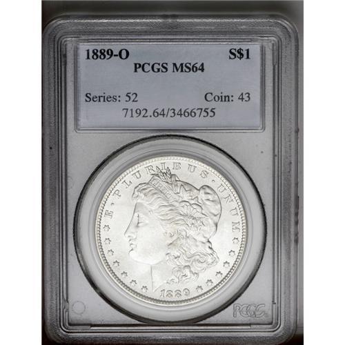 <B>1889-O<img border='0' src='http://www.heritagecoins.com/images/star.gif' width=10 height=10>$1 MS64 PCGS.</B></I> Another New Orleans issue with a low survivability rate for upper-end Mint State examples. This lovely piece is mostly brilliant, with light marks and shimmering mint frost on both sides.
