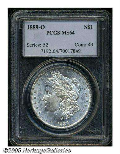 <B>1889-O<S$1> MS64 PCGS.</B></I> Premium quality for the grade with mostly untoned, lustrous surfaces, and only a few light marks on Liberty's cheek and neck and in the obverse fields that keep the piece from a true Gem. The design elements are adequately struck, except for the usual weakness in the hair over Liberty's ear. The eagle's breast feathers, while not fully defined, reveal a better than average impression.