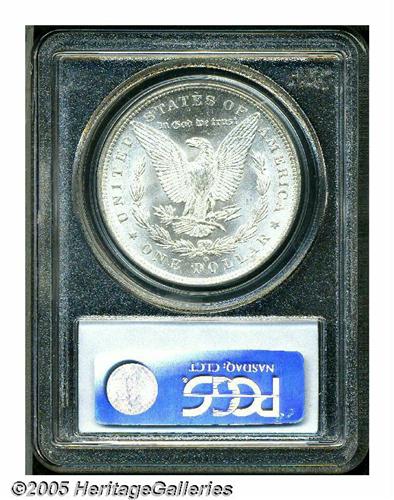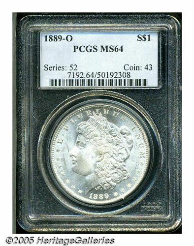 <B>1889-O<S$1> MS64 PCGS.</B></I> The 1889-O is very plentiful in low Mint State ranges of MS60 to MS62. It becomes scarce in MS63, and scarcer yet in MS64, with about 2,500 to 5,000 pieces extant. The current example is nearly untoned, with radiant luster, and just a couple of minor scuffs in the left (facing) obverse field. The design elements are adequately struck, though the hair over Liberty's ear is weak.