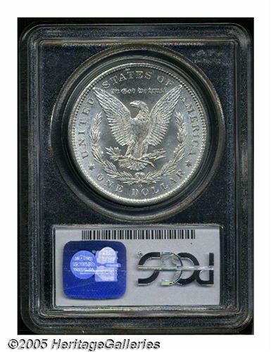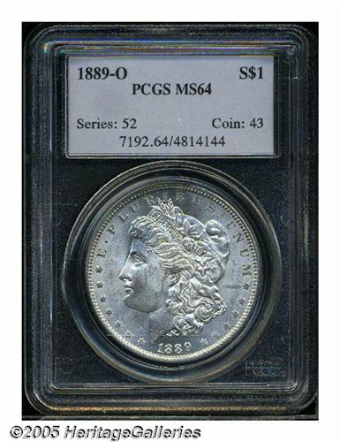 <B>1889-O<S$1> MS64 PCGS.</B></I> The '89-O is relatively plentiful in lower Mint State grades. In MS63 the issue becomes scarce, and in MS64 is scarcer yet. Bowers (1993) estimates about 2,500 to 5,000 specimens to be extant in this grade. The coin in this lot has flashy luster and virtually white surfaces. The design elements are adequately struck, with only the hair over Liberty's ear revealing the usual weakness. Minor luster grazes on Liberty's cheek and in the obverse fields preclude a higher grade. A very sharp eye appealing coin for the grade.
