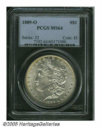 <B>1889-O<S$1> MS64 PCGS.</B></I> Typically softly struck over the centers, with bright, matte-like surfaces that are essentially brilliant, save for slight, attractive golden rim toning on both sides. A few wispy slide marks on Liberty's cheek, and a mild luster graze in the left obverse field, seem to limit the grade of this otherwise Gem-like example.