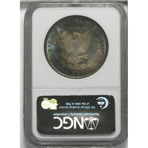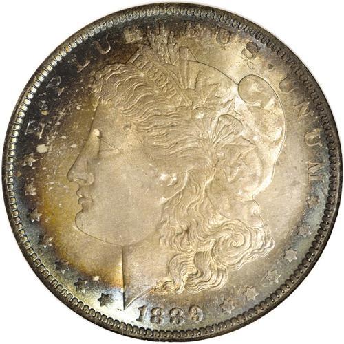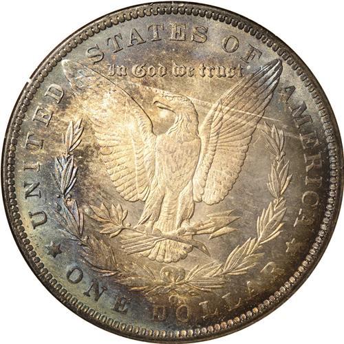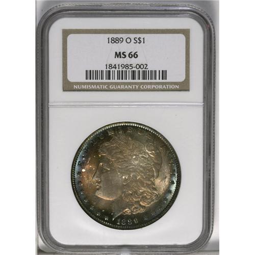 <B>1889-O<img border='0' src='http://www.heritagecoins.com/images/star.gif' width=10 height=10>$1> MS66 NGC.</B></I> Although this issue was struck in enormous quantities, today Gems are rare, although they are encountered infrequently. Strike quality, as with so many New Orleans issues, is problematic. A gander at the population data of NGC and PCGS is instructive: While NGC has graded more than 2,400 Mint State examples, only 46 are in MS65, with five coins in MS66 and none finer (6/06). PCGS has certified more than 3,800 Mint State pieces, but only 109 Gems and nine MS66 coins. This example has beautiful, moderately deep toning with concentric sunset-orange surrounded by steel-blue on both sides, through which brilliant luster shines. While not fully struck, the strike is considerably better than usual, and there are few abrasions. A nick on the lower right (facing) breast of the eagle is noted.<BR><I>From The Belle Glade Collection.</B></I>