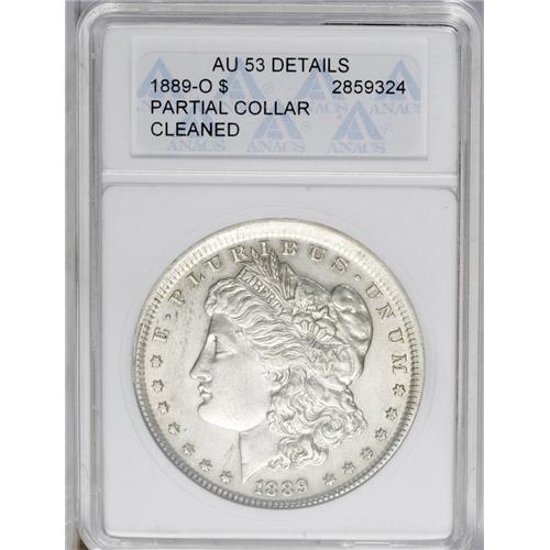 <B>1889-O<img border='0' src='http://www.heritagecoins.com/images/star.gif' width=10 height=10>$1> Morgan Dollar--Partial Collar, Cleaned--ANACS. AU53 Details.</B></I> This lightly toned and partly lustrous piece has the appearance of an uncentered broadstrike. A broad raised band of unstruck surface is centered at 12 o'clock. Light hairlines and a couple of pinscratches are noted.