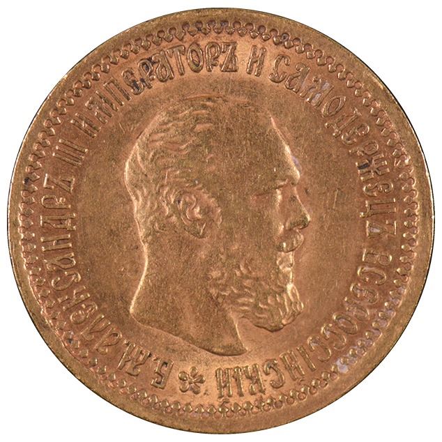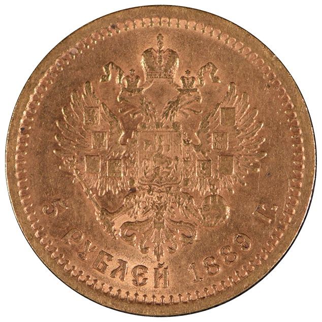 One 1889 Russia 5 Roubles Gold Coin.