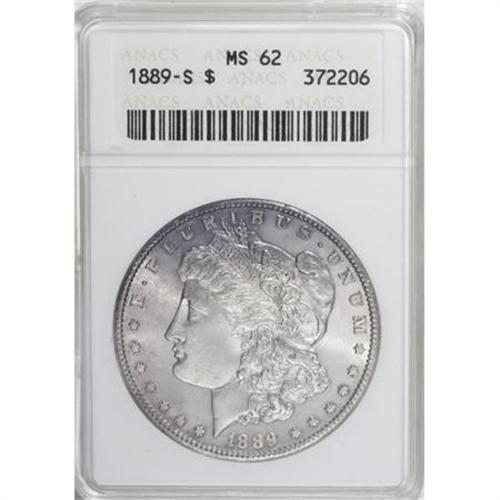 <B>1889-S $1 MS62 ANACS.</B></I> . NGC Census: (587/2469). PCGS Population (947/4494). Mintage: 700,000. Numismedia Wsl. Price for NGC/PCGS coin in MS62: $200. (#7194)<BR><BR><B>Coin Engraver:</B> George T. Morgan<BR><BR><b>Shipping:</b> Coins & Currency (<a target="_blank" href="http://www.heritageauctions.com/common/shipping.php">view shipping information</a>)