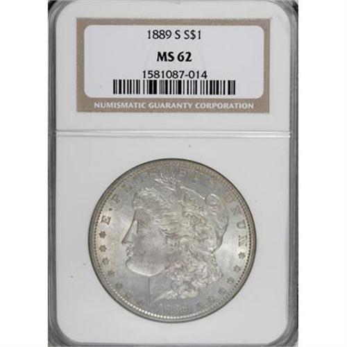 <B>1889-S $1 MS62 NGC.</B></I> NGC Census: (570/2443). PCGS Population (936/4357). Mintage: 700,000. Numismedia Wsl. Price for NGC/PCGS coin in MS62: $200. (#7194)<BR><BR><B>Coin Engraver:</B> George T. Morgan<BR><BR><b>Shipping:</b> Coins & Currency (<a target="_blank" href="http://www.heritageauctions.com/common/shipping.php">view shipping information</a>)