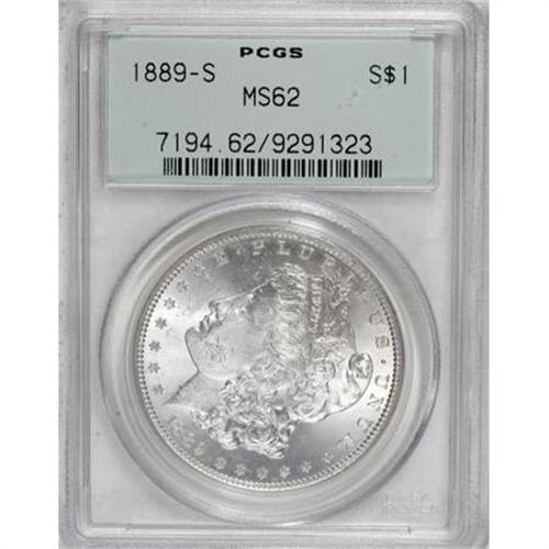 <B>1889-S $1 MS62 PCGS.</B></I> PCGS Population (936/4357). NGC Census: (570/2443). Mintage: 700,000. Numismedia Wsl. Price for NGC/PCGS coin in MS62: $200. (#7194)<BR><BR><B>Coin Engraver:</B> George T. Morgan<BR><BR><b>Shipping:</b> Coins & Currency (<a target="_blank" href="http://www.heritageauctions.com/common/shipping.php">view shipping information</a>)