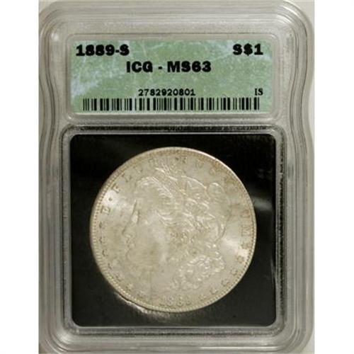 <B>1889-S $1 MS63 ICG.</B></I> NGC Census: (1090/1339). PCGS Population (2035/2282). Mintage: 700,000. Numismedia Wsl. Price for NGC/PCGS coin in MS63: $300. (#7194)<BR><BR><B>Coin Engraver:</B> George T. Morgan<BR><BR><b>Shipping:</b> Coins & Currency (<a target="_blank" href="http://www.heritageauctions.com/common/shipping.php">view shipping information</a>\)