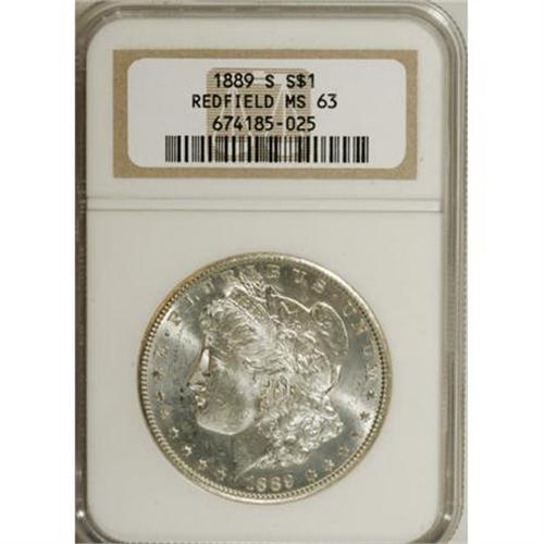 <B>1889-S $1 MS63 NGC.</B></I> Ex: Redfield. NGC Census: (1092/1340). PCGS Population (2045/2307). Mintage: 700,000. Numismedia Wsl. Price for NGC/PCGS coin in MS63: $300. (#7194)<BR><BR><B>Coin Engraver:</B> George T. Morgan<BR><BR><b>Shipping:</b> Coins & Currency (<a target="_blank" href="http://www.heritageauctions.com/common/shipping.php">view shipping information</a>)