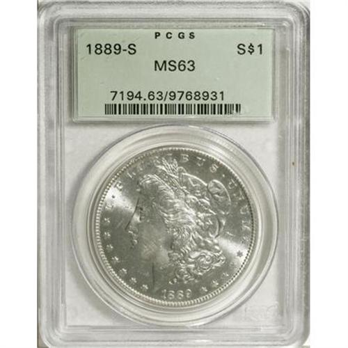 <B>1889-S $1 MS63 PCGS.</B></I> PCGS Population (2047/2351). NGC Census: (1098/1345). Mintage: 700,000. Numismedia Wsl. Price for NGC/PCGS coin in MS63: $300. (#7194)<BR><BR><B>Coin Engraver:</B> George T. Morgan<BR><BR><b>Shipping:</b> Coins & Currency (<a target="_blank" href="http://www.heritageauctions.com/common/shipping.php">view shipping information</a>)