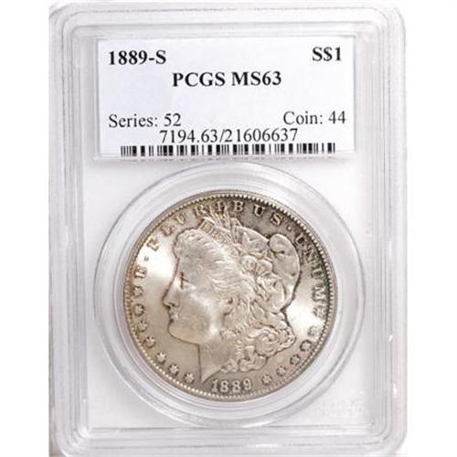 <B>1889-S $1 MS63 PCGS.</B></I> PCGS Population (2061/2383). NGC Census: (1113/1345). Mintage: 700,000. Numismedia Wsl. Price for NGC/PCGS coin in MS63: $300. (#7194)<BR><BR><B>Coin Engraver:</B> George T. Morgan<BR><BR><b>Shipping:</b> Coins & Currency (<a target="_blank" href="http://www.heritageauctions.com/common/shipping.php">view shipping information</a>)
