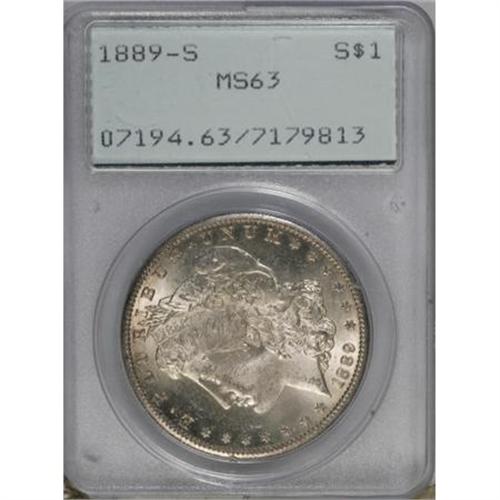<B>1889-S $1 MS63 PCGS.</B></I> PCGS Population (2078/2447). NGC Census: (1122/1356). Mintage: 700,000. Numismedia Wsl. Price for NGC/PCGS coin in MS63: $300. (#7194)<BR><BR><B>Coin Engraver:</B> George T. Morgan<BR><BR><b>Shipping:</b> Coins & Currency (<a target="_blank" href="http://www.heritageauctions.com/common/shipping.php">view shipping information</a>)
