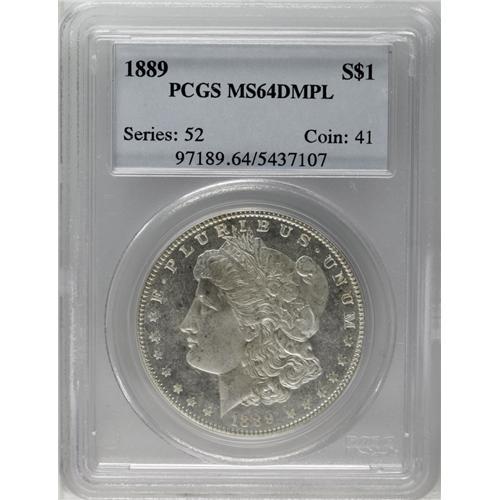 <B>1889<img border='0' src='http://www.heritagecoins.com/images/star.gif' width=10 height=10>$1> MS64 Deep Mirror Prooflike PCGS.</B></I> Light accents of gold and brown, spotted darkly in places, cover the deeply reflective fields. A soft strike, typical for the issue, and marks in the field preclude Gem status. Overall, a worthy example of this scarce date.<BR><I>From The Chicago-Ark Collection.</B></I>
