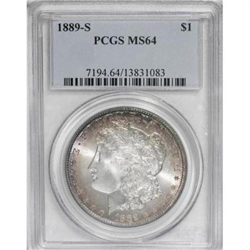 <B>1889-S $1 MS64 PCGS.</B></I> PCGS Population (1698/534). NGC Census: (1097/232). Mintage: 700,000. Numismedia Wsl. Price for NGC/PCGS coin in MS64: $432. (#7194)<BR><BR><B>Coin Engraver:</B> George T. Morgan<BR><BR><b>Shipping:</b> Coins & Currency (<a target="_blank" href="http://www.heritageauctions.com/common/shipping.php">view shipping information</a>\)