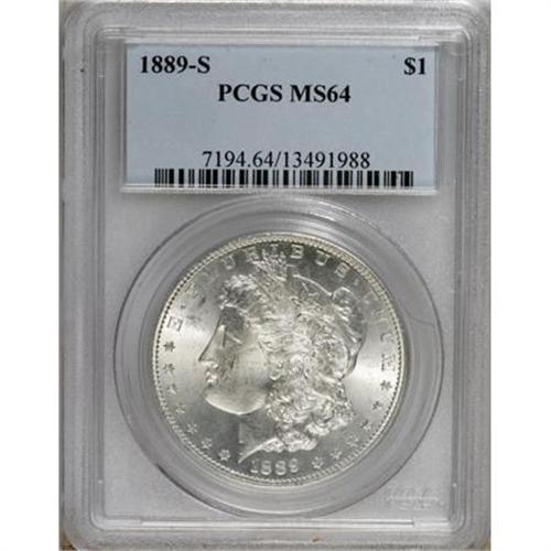 <B>1889-S $1 MS64 PCGS.</B></I> Both sides offer plenty of flash, and the reverse is semi-prooflike at a minimum. An essentially untoned, solidly struck Choice example of this lower-mintage San Francisco issue, which amounted to just 700,000 pieces.<BR><BR><B>Coin Engraver:</B> George T. Morgan<BR><BR><b>Shipping:</b> Coins & Currency (<a target="_blank" href="http://www.heritageauctions.com/common/shipping.php">view shipping information</a>)