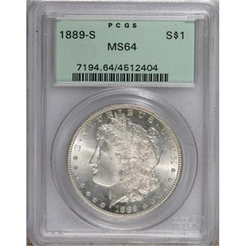 <B>1889-S $1 MS64 PCGS.</B></I> PCGS Population (1754/546). NGC Census: (1106/234). Mintage: 700,000. Numismedia Wsl. Price for NGC/PCGS coin in MS64: $432. (#7194)<BR><BR><B>Coin Engraver:</B> George T. Morgan<BR><BR><b>Shipping:</b> Coins & Currency (<a target="_blank" href="http://www.heritageauctions.com/common/shipping.php">view shipping information</a>)