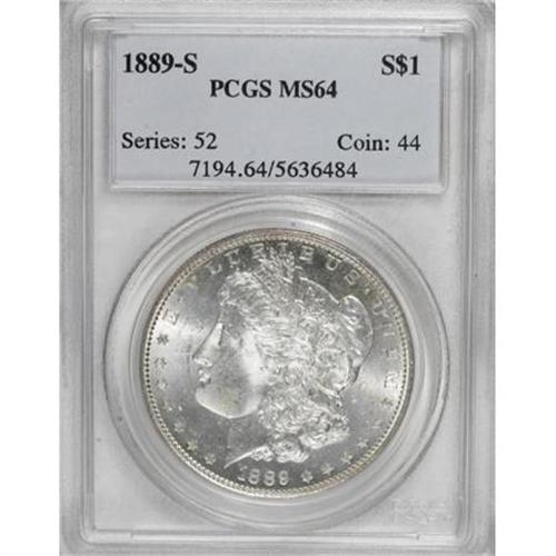 <B>1889-S $1 MS64 PCGS.</B></I> PCGS Population (1764/545). NGC Census: (1110/235). Mintage: 700,000. Numismedia Wsl. Price for NGC/PCGS coin in MS64: $432. (#7194)<BR><BR><B>Coin Engraver:</B> George T. Morgan<BR><BR><b>Shipping:</b> Coins & Currency (<a target="_blank" href="http://www.heritageauctions.com/common/shipping.php">view shipping information</a>)