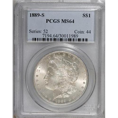 <B>1889-S $1 MS64 PCGS.</B></I> PCGS Population (1788/553). NGC Census: (1110/235). Mintage: 700,000. Numismedia Wsl. Price for NGC/PCGS coin in MS64: $432. (#7194)<BR><BR><B>Coin Engraver:</B> George T. Morgan<BR><BR><b>Shipping:</b> Coins & Currency (<a target="_blank" href="http://www.heritageauctions.com/common/shipping.php">view shipping information</a>)