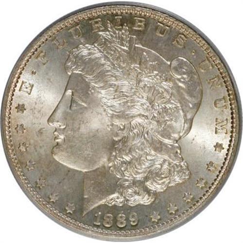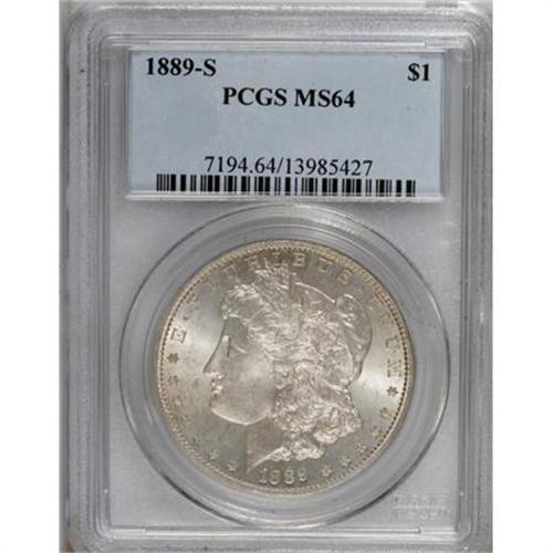 <B>1889-S $1 MS64 PCGS.</B></I> PCGS Population (1788/553). NGC Census: (1110/235). Mintage: 700,000. Numismedia Wsl. Price for NGC/PCGS coin in MS64: $432. (#7194)<BR><BR><B>Coin Engraver:</B> George T. Morgan<BR><BR><b>Shipping:</b> Coins & Currency (<a target="_blank" href="http://www.heritageauctions.com/common/shipping.php">view shipping information</a>)