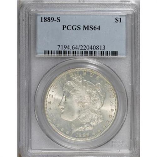 <B>1889-S $1 MS64 PCGS.</B></I> PCGS Population (1788/553). NGC Census: (1110/235). Mintage: 700,000. Numismedia Wsl. Price for NGC/PCGS coin in MS64: $432. (#7194)<BR><BR><B>Coin Engraver:</B> George T. Morgan<BR><BR><b>Shipping:</b> Coins & Currency (<a target="_blank" href="http://www.heritageauctions.com/common/shipping.php">view shipping information</a>)
