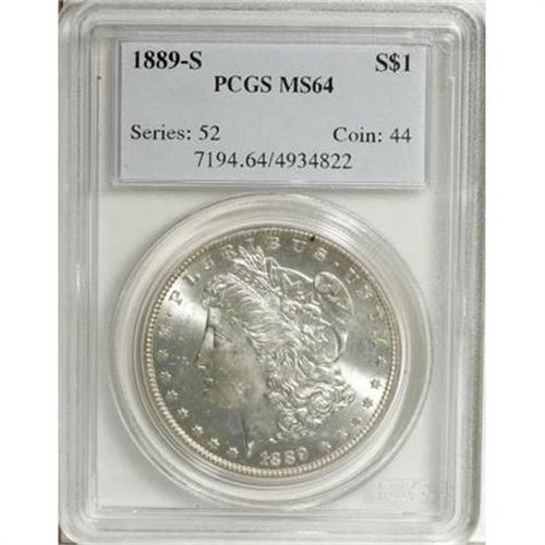<B>1889-S $1 MS64 PCGS.</B></I> PCGS Population (1794/557). NGC Census: (1110/235). Mintage: 700,000. Numismedia Wsl. Price for NGC/PCGS coin in MS64: $432. (#7194)<BR><BR><B>Coin Engraver:</B> George T. Morgan<BR><BR><b>Shipping:</b> Coins & Currency (<a target="_blank" href="http://www.heritageauctions.com/common/shipping.php">view shipping information</a>)
