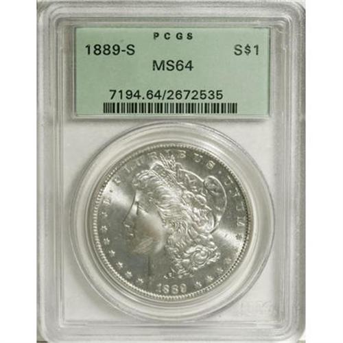 <B>1889-S $1 MS64 PCGS.</B></I> PCGS Population (1794/557). NGC Census: (1110/235). Mintage: 700,000. Numismedia Wsl. Price for NGC/PCGS coin in MS64: $432. (#7194)<BR><BR><B>Coin Engraver:</B> George T. Morgan<BR><BR><b>Shipping:</b> Coins & Currency (<a target="_blank" href="http://www.heritageauctions.com/common/shipping.php">view shipping information</a>)