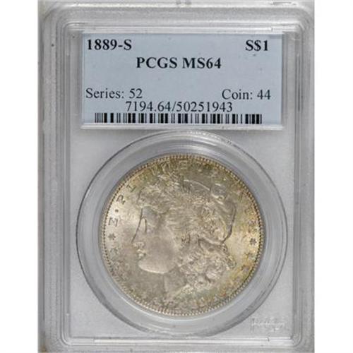 <B>1889-S $1 MS64 PCGS.</B></I> Lustrous surfaces display yellow-gold and gray patina imbued with traces of green and rose, and are well impressed, including good definition in the hair at Liberty's ear and the eagle's breast feathers. A few minuscule marks do not detract.<BR><BR><B>Coin Engraver:</B> George T. Morgan<BR><BR><b>Shipping:</b> Coins & Currency (<a target="_blank" href="http://www.heritageauctions.com/common/shipping.php">view shipping information</a>)