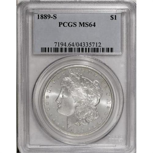 <B>1889-S $1 MS64 PCGS.</B></I> . PCGS Population (1855/568). NGC Census: (1111/237). Mintage: 700,000. Numismedia Wsl. Price for NGC/PCGS coin in MS64: $440. (#7194)<BR><BR><B>Coin Engraver:</B> George T. Morgan<BR><BR><b>Shipping:</b> Coins & Currency (<a target="_blank" href="http://www.heritageauctions.com/common/shipping.php">view shipping information</a>)