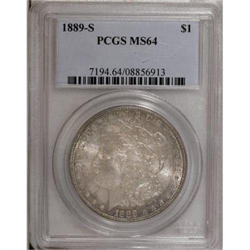 <B>1889-S $1 MS64 PCGS.</B></I> PCGS Population (1867/575). NGC Census: (1114/237). Mintage: 700,000. Numismedia Wsl. Price for NGC/PCGS coin in MS64: $440. (#7194)<BR><BR><B>Coin Engraver:</B> George T. Morgan<BR><BR><b>Shipping:</b> Coins & Currency (<a target="_blank" href="http://www.heritageauctions.com/common/shipping.php">view shipping information</a>)