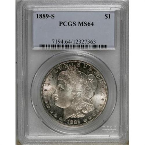 <B>1889-S $1 MS64 PCGS.</B></I> PCGS Population (1893/580). NGC Census: (1125/239). Mintage: 700,000. Numismedia Wsl. Price for NGC/PCGS coin in MS64: $440. (#7194)<BR><BR><B>Coin Engraver:</B> George T. Morgan<BR><BR><b>Shipping:</b> Coins & Currency (<a target="_blank" href="http://www.heritageauctions.com/common/shipping.php">view shipping information</a>)