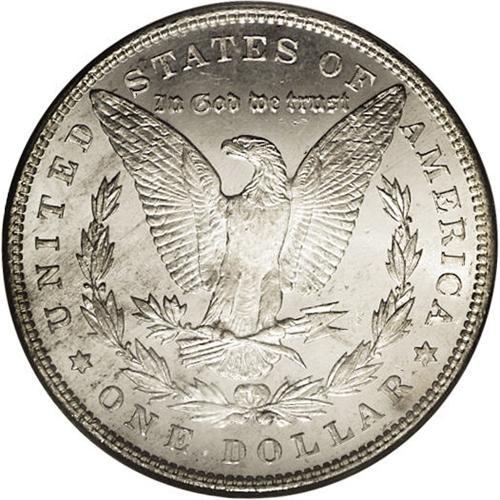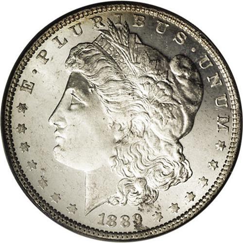 <B>1889<img border='0' src='http://www.heritagecoins.com/images/star.gif' width=10 height=10>$1> MS65 Deep Mirror Prooflike PCGS.</B></I> Mostly brilliant, with traces of gold and sky-gray emerging near the rims. This is a lustrous, well struck and carefully preserved representative of this issue, one that is common without prooflike fields in MS63 to MS64 grades, but surprisingly rare as a Gem with prominent mirrors. Certified in a green label holder. Population: 31 in 65 Prooflike, 3 finer (4/06).