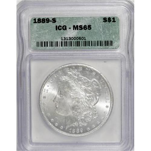 <B>1889-S $1 MS65 ICG.</B></I> Virtually white surfaces display nice luster and sharply struck design elements. A few light marks on Liberty's cheek and on the eagle do not distract.<BR><BR><B>Coin Engraver:</B> George T. Morgan<BR><BR><b>Shipping:</b> Coins & Currency (<a target="_blank" href="http://www.heritageauctions.com/common/shipping.php">view shipping information</a>)