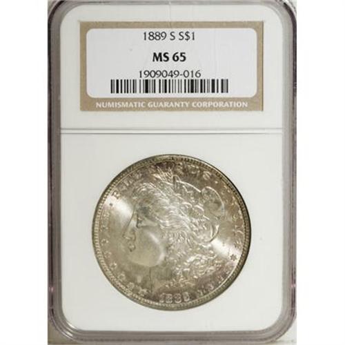 <B>1889-S $1 MS65 NGC.</B></I> Solidly struck for this S-mint issue with lovely violet and cloud-gray patina at the margins and delicate silver-gray centers. Vibrant luster enlivens the carefully preserved surfaces.<BR><BR><B>Coin Engraver:</B> George T. Morgan<BR><BR><b>Shipping:</b> Coins & Currency (<a target="_blank" href="http://www.heritageauctions.com/common/shipping.php">view shipping information</a>)