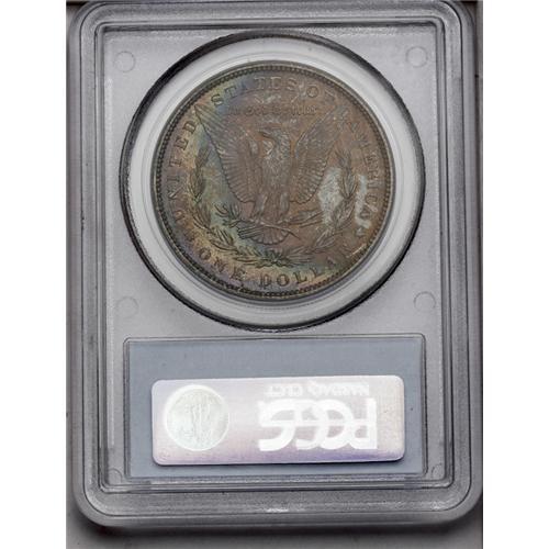 <B>1889<img border='0' src='http://www.heritagecoins.com/images/star.gif' width=10 height=10>$1> MS65 PCGS.</B></I> Lustrous surfaces are overlain with waves of aqua-blue, lavender, and orange-tan patina, and reveal just a few minor marks on Liberty's cheek and forehead. The design features are well impressed, save for a touch of softness in the hair over Liberty's ear.
