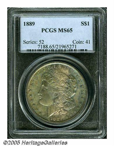 <B>1889<S$1> MS65 PCGS.</B></I> Well struck and vibrantly lustrous, with a rich coating of dappled, variegated patina over both obverse and reverse. A handful of trivial contact marks seem evident on each side, but they are well hidden by the deep toning. An attractive no-questions Gem.