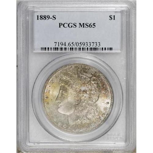 <B>1889-S $1 MS65 PCGS.</B></I> Low intensity multicolored toning races over the obverse of this S-mint Gem, leaving the reverse brilliant. Radiantly lustrous surfaces reveal some light grade-consistent marks on the obverse. The design features are typically struck.<BR><BR><B>Coin Engraver:</B> George T. Morgan<BR><BR><b>Shipping:</b> Coins & Currency (<a target="_blank" href="http://www.heritageauctions.com/common/shipping.php">view shipping information</a>)