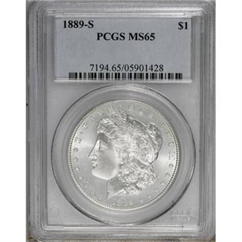 <B>1889-S $1 MS65 PCGS.</B></I> This flashy and nearly brilliant silver dollar has a precise strike and generally clean surfaces. A low mintage of 700,000 pieces adds speculator interest to the demand.<BR><BR><B>Coin Engraver:</B> George T. Morgan<BR><BR><b>Shipping:</b> Coins & Currency (<a target="_blank" href="http://www.heritageauctions.com/common/shipping.php">view shipping information</a>)