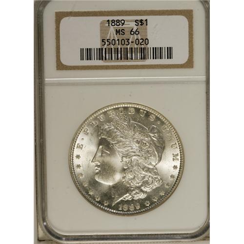 <B>1889 S$1 MS66 NGC.</B></I> VAM-20. Liberty's ear, and the hair above, are nicely die doubled. Lustrous, brilliant, and crisply struck. The 1889 silver dollar is high mintage, but is conditionally rare above the MS65 level. NGC has certified only one piece in MS67 or finer grades, in contrast with the low mintage (but well preserved) 1889 <I>gold</B></I> dollar, which has nearly 200 such pieces.<BR><BR><b>Shipping:</b> Coin/Currency (<a target="_blank" href="http://www.heritageauctions.com/common/shipping.php">view shipping information</a>)
