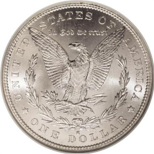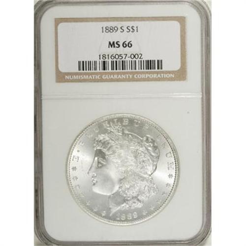 <B>1889-S $1 MS66 NGC.</B></I> Sparkling luster abounds on this gorgeous Premium Gem dollar, and a well executed strike left its imprint on the design elements, including good definition on the hair at Liberty's ear and on the eagle's breast feathers. Color-free surfaces reveal no marks that are worthy of individual mention. Readily available in the lower grades of Mint State, but tough in MS66 and above. Census: 24 in 66, 0 finer (6/07).<BR><I>From the Reuben Reinstein Collection.</B></I><BR><BR><b>Shipping:</b> Coins & Currency (<a target="_blank" href="http://www.heritageauctions.com/common/shipping.php">view shipping information</a>)