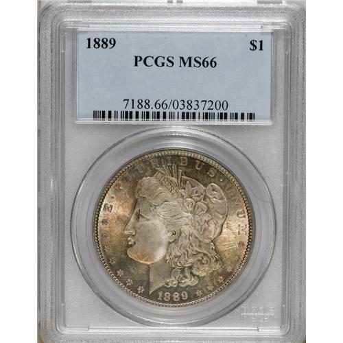 <B>1889 S$1 MS66 PCGS.</B></I> A radiantly lustrous Premium Gem that is bathed in cobalt-blue, golden-brown, and lavender, which is more intense and continuous on the obverse. Generally well struck, except for the usual softness in the centers. Both sides are quite clean, with no significant abrasions. Probably about half of the 21 million-plus mintage was melted.<BR><BR><b>Shipping:</b> Coins & Currency (<a target="_blank" href="http://www.heritageauctions.com/common/shipping.php">view shipping information</a>)