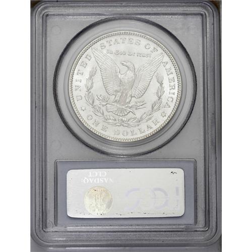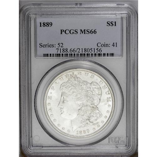 <B>1889<img border='0' src='http://www.heritagecoins.com/images/star.gif' width=10 height=10>$1 MS66 PCGS.</B></I> Probably more than half of the 21.7 million 1889 Morgan dollars were melted under the 1918 Pittman Act and other legislation. Despite this, the issue is very common in Mint State. The MS66 example offered in this lot displays bright, near-white lustrous surfaces that have been lovingly preserved. Just a few minor scuffs on Liberty's cheek, and in the left obverse and right reverse fields, are mentioned for accuracy. The design elements are generally well impressed. The only exception is softness in the hair over Liberty's ear and on the eagle's breast, which is typical for this series in which most examples are weakly struck at the centers.<BR><I>From The Leslie E. Lunsford Collection, #7 Current Finest Registry Morgan Dollars Basic Set, Circulation Strikes.</B></I>