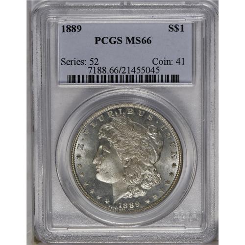 <B>1889<img border='0' src='http://www.heritagecoins.com/images/star.gif' width=10 height=10>$1> MS66 PCGS.</B></I> This shimmering Premium Gem's untoned fields show slight reflectivity. The devices are toned a pale red and sharply struck for the issue. Only a few tiny abrasions appear in the field.<BR><I>From The Chicago-Ark Collection.</B></I>