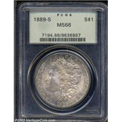 <table><tr><td><TABLE cellSpacing=0 cellPadding=0 width="100%" bgColor=#000000 border=0><TBODY> <TR><TD width="100%"><TABLE cellSpacing=1 cellPadding=3 width="100%" border=0><TBODY><TR><TD width="100%" bgColor=#79735c><FONT face=arial color=#ffffff size=3><B>Description</B> </FONT></TD></TR><TR><TD width="100%" bgColor=#ffffff><FONT face=arial size=2><B>1889-S $1 MS66 PCGS.</B></I> A superbly toned and equally well preserved representative that is likely from a source other than the Redfield Hoard. The surfaces are predominately smooth and problem-free, and each side boasts an appealing cartwheel sheen under a mixture of orange-gold and lilac toning. Very scarce in such a superior state of preservation. Population: 35 in 66, 1 finer (10/03). </FONT></TD></TR></TBODY></TABLE></TD></TR></TBODY></TABLE><BR><A name=PricesRealized></A><TABLE cellSpacing=0 cellPadding=0 width="100%" bgColor=#000000 border=0><TBODY><TR><TD width="100%"><TABLE cellSpacing=1 cellPadding=3 width="100%" border=0><TBODY><TR><TD width="100%" bgColor=#79735c><A name=PR><FONT face=arial color=#ffffff size=3><B>Previous Prices from Heritage Auctions</B> </FONT></A></TD></TR><TR><TD bgColor=#f6f6ed><TABLE cellSpacing=0 cellPadding=0 width="100%" border=1><TBODY><TR><TD align=middle width="33%"><B>Date</B></TD><TD align=middle width="33%"><B>Service</B></TD><TD align=middle width="33%"><B>Price</B></TD></TR><TR bgColor=whitesmoke><TD width="33%"><B>04/27/2002</B></TD><TD width="33%">NGC</TD><TD width="33%">$2,645.00</TD></TR><TR bgColor=whitesmoke><TD width="33%"><B>09/01/1998</B></TD><TD width="33%">PCGS</TD><TD width="33%">$3,450.00</TD></TR><TR bgColor=whitesmoke><TD width="33%"><B>11/01/1999</B></TD><TD width="33%">PCGS</TD><TD width="33%">$2,640.00</TD></TR><TR bgColor=whitesmoke><TD width="33%"><B>01/01/1999</B></TD><TD width="33%">PCGS</TD><TD width="33%">$3,335.00</TD></TR><TR bgColor=whitesmoke><TD width="33%"><B>11/01/1998</B></TD><TD width="33%">NGC</TD><TD width="33%">$3,220.00</TD></TR></TBODY></TABLE></TD></TR><TR><TD bgColor=#ffffff><FONT face=arial size=1 ?>PLEASE NOTE: All prices realized reflect the final hammer price PLUS the buyer's premium in auctions that charge a buyer's premium. Each item has a notation at the top of the listing indicating whether that lot included a buyer's premium. Example: A item that sells with a final hammer price of $100 and a 20% buyer's premium will display with a price realized of $120. All information listed is intended to be as accurate as possible, but errors are possible. Please use this guide carefully and inform us of any inaccuracies. </FONT></TD></TR></TBODY></TABLE></TD></TR></TBODY></TABLE><BR><TABLE cellSpacing=0 cellPadding=0 width="100%" bgColor=#000000 border=0><TBODY><TR><TD width="100%"><TABLE cellSpacing=1 cellPadding=3 width="100%" border=0><TBODY><TR><TD width="100%" bgColor=#79735c colSpan=6><FONT face=arial color=#ffffff size=3><B>Price Guide*</B> </FONT></TD></TR><TR bgColor=#f6f6ed><TD align=middle><B>Grade</B> </TD><TD align=middle><B>Coin World<BR>(Trends)</B> </TD><TD align=middle><B>Numismedia<BR>Retail</B> </TD><TD align=middle><B>Numismedia<BR>Wholesale</B> </TD><TD align=middle><B>Coin<BR>Universe</B> </TD><TD align=middle><B>Heritage<BR>Value Index</B> </TD></TR><TR bgColor=#ffffff><TD align=middle>65</TD><TD align=right>$2,000.00</TD><TD align=right>---</TD><TD align=right>$1,375.00</TD><TD align=right>$2,000.00</TD><TD align=right>$1,302.50</TD></TR><TR style="FONT-WEIGHT: bold" bgColor=#cccfdd><TD align=middle>66</TD><TD align=right>$5,250.00</TD><TD align=right>---</TD><TD align=right>$3,150.00</TD><TD align=right>$5,000.00</TD><TD align=right>$3,591.67</TD></TR><TR bgColor=#ffffff><TD align=middle>67</TD><TD align=right>---</TD><TD align=right>---</TD><TD align=right>$23,500.00</TD><TD align=right>$18,500.00</TD><TD align=right>$14,125.00</TD></TR><TR bgColor=#ffffff><TD colSpan=6><FONT size=1>*All information listed is intended to be as accurate as possible, but errors are possible. No item may be returned or refused based on this information which is provided as a service to our customers. You should contact each pricing source directly to determine the accuracy of this information. </FONT></TD></TR></TBODY></TABLE></TD></TR></TBODY></TABLE><BR><TABLE cellSpacing=0 cellPadding=0 width="100%" bgColor=#000000 border=0><TBODY><TR><TD width="100%"><TABLE cellSpacing=1 cellPadding=3 width="100%" border=0><TBODY><TR><TD width="100%" bgColor=#79735c><FONT face=arial color=#ffffff size=3><B>Population Guide</B> </FONT></TD></TR><TR bgColor=#ffffff><TD align=middle><!-- Begin Output of Population Grid--><TABLE cellSpacing=0 cellPadding=0 width="100%" border=0><TBODY><TR><TD vAlign=center><TABLE cellSpacing=0 width="100%" border=1 cellsadding="3"><TBODY><TR><TD vAlign=center><TABLE cellSpacing=0 cellPadding=3 width="100%" border=1><TBODY><TR><TD vAlign=center align=middle bgColor=#f0f1e8 colSpan=2 <CENTER><FONT face=Arial size=2><B>PCGS Pop </B></FONT><CENTER></CENTER></TD><TD vAlign=center align=middle bgColor=#f0f1e8 colSpan=2><CENTER><FONT face=Arial size=2><B>NGC Pop</B></CENTER></FONT></TD></TR><TR><TD vAlign=center><FONT face=Arial size=2>(66)</FONT> </TD><TD vAlign=center align=right><FONT face=Arial size=2>35</FONT> </TD><TD vAlign=center><FONT face=Arial size=2>(66)</FONT> </TD><TD vAlign=center align=right><FONT face=Arial size=2>14</FONT> </TD></TR><TR><TD vAlign=center><FONT face=Arial size=2>(>66)</FONT> </TD><TD vAlign=center align=right><FONT face=Arial size=2>1</FONT> </TD><TD vAlign=center><FONT face=Arial size=2>(>66)</FONT> </TD><TD vAlign=center align=right><FONT face=Arial size=2>0</FONT> </TD></TR></TBODY></TABLE></TD></TR></TBODY></TABLE></TD></TR></TBODY></TABLE><!-- End Output of Population Grid--></TD></TR></TBODY></TABLE></TD></TR></TBODY></TABLE><BR><TABLE cellSpacing=0 cellPadding=0 width="100%" bgColor=#000000 border=0><TBODY><TR> Important notice: Heritage usually auctions material at the rate of 200-250 lots per h