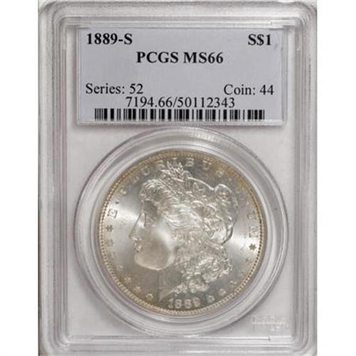 <B>1889-S $1 MS66 PCGS.</B></I> This Premium Gem has fully brilliant silver surfaces with sharp design features and only the faintest traces of dusty gold toning. Of all the Morgan dollars produced between the years of 1878 and 1921, from five different mints, only 18 issues had mintages of less than one million coins, and this 1889-S is one of those 18. In fact, the mintage of 700,000 coins places this in the 15th position among the lowest mintage Morgans. Among the examples certified by PCGS and NGC, just one coin has been graded finer. Population: 61 in 66, 1 finer (11/07).<BR><I>From The Motor City Collection.</B></I><BR><BR><B>Coin Engraver:</B> George T. Morgan<BR><BR><b>Shipping:</b> Coins & Currency (<a target="_blank" href="http://www.heritageauctions.com/common/shipping.php">view shipping information</a>)