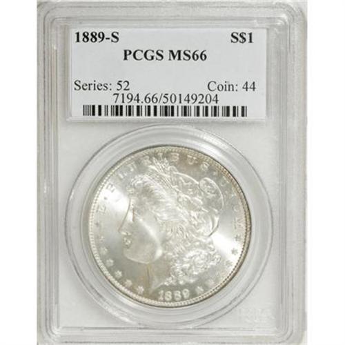 <B>1889-S $1 MS66 PCGS.</B></I> The 1889-S has an impressively low mintage of only 700,000 pieces. High grade examples are especially elusive with PCGS having only certified 62 pieces with one finer (1/08). Most '89-S dollars show excellent luster characteristics, and this coin certainly does also. Brilliant throughout with bold central definition on each side. Population: 62 in 66, 1 finer (1/08).<BR><I>From The Jimmy G. PCGS Registry Collection of Morgan Dollars with Varieties.</B></I><BR><BR><B>Coin Engraver:</B> George T. Morgan<BR><BR><b>Shipping:</b> Coins & Currency (<a target="_blank" href="http://www.heritageauctions.com/common/shipping.php">view shipping information</a>)