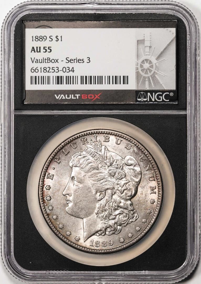 One 1889-S $1 Morgan Silver Dollar Coin NGC AU55 Vaultbox Series 3. NGC Certified.